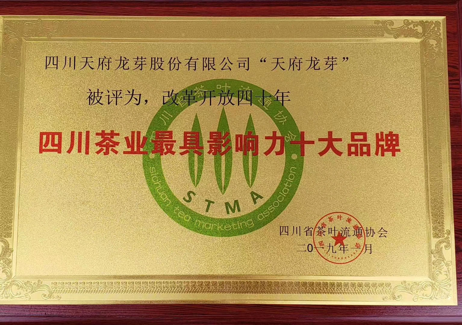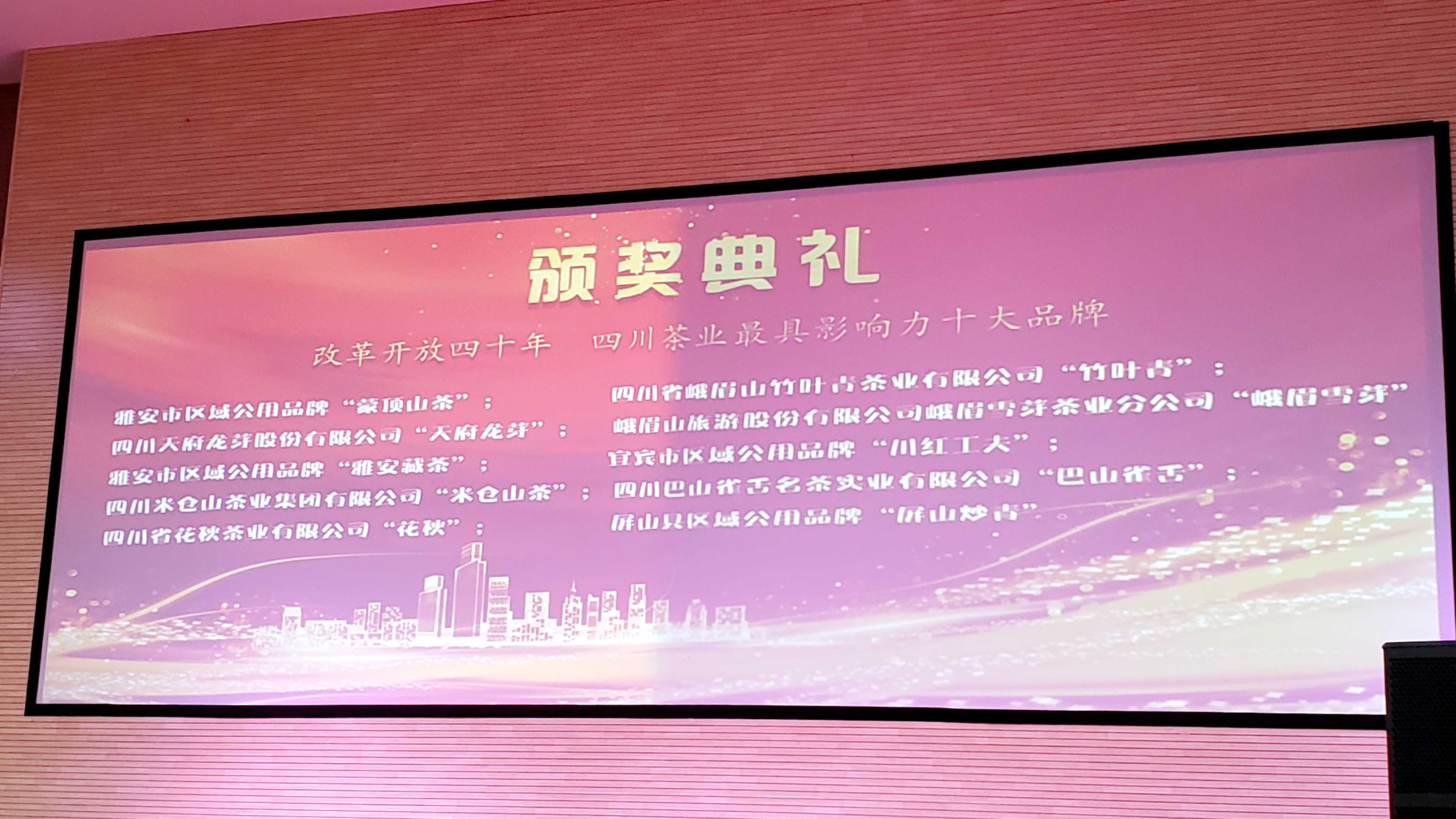 在现场进行的改革开放40年四川茶业表彰中,对四川茶业十大特色优势县、四川茶业十大优秀企业、四川茶业最具影响力十大优秀品牌、四川茶业最具发展潜力品牌、最具影响力茶叶市场、四川茶业终身成就奖、四川茶业突出贡献人物、四川茶业新锐人物等九个奖项进行了表彰。其中,四川天府龙芽股份有限公司的“天府龙芽”品牌荣获“四川茶业最具影响力十大优秀品牌”奖。